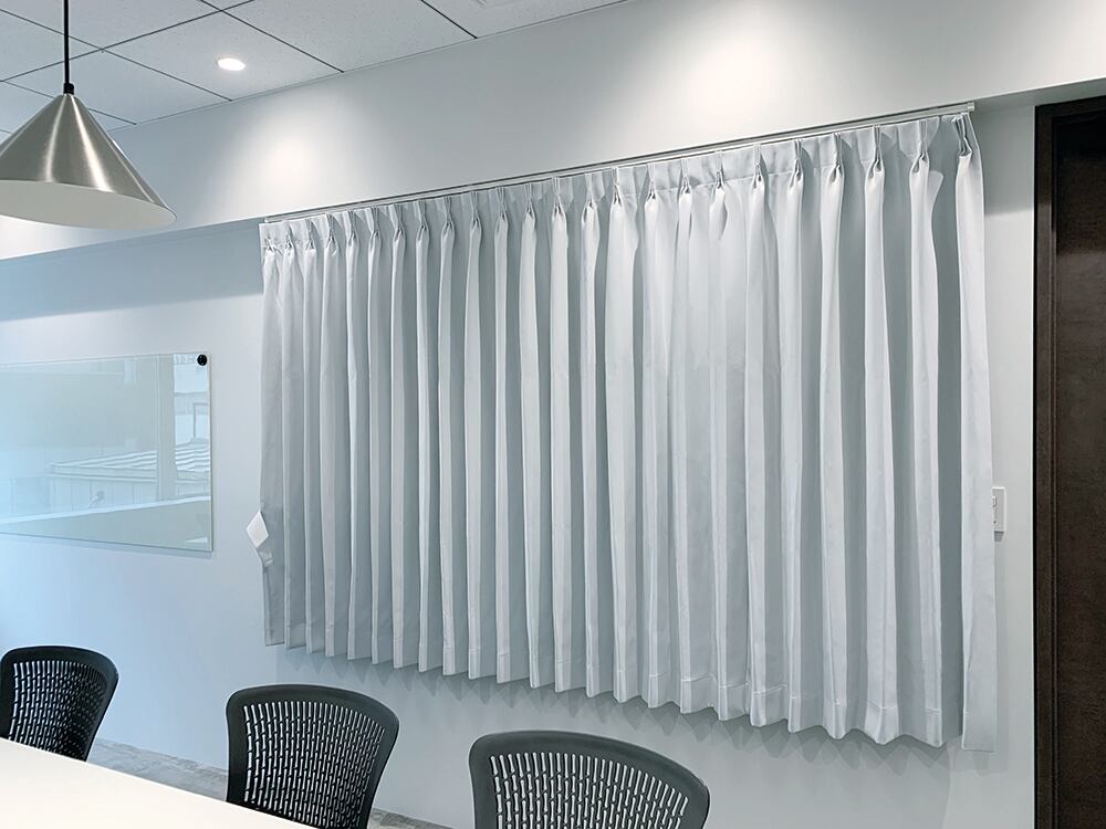 一般的なドレープカーテンと比較して約2倍の吸音性能がある吸音ドレープカーテンです。防炎・遮光・ウォッシャブル性能があり、風合いの違う2種類の生地からお選びいただけます。特にBT生地は完全遮光に匹敵する遮光性を誇ります。